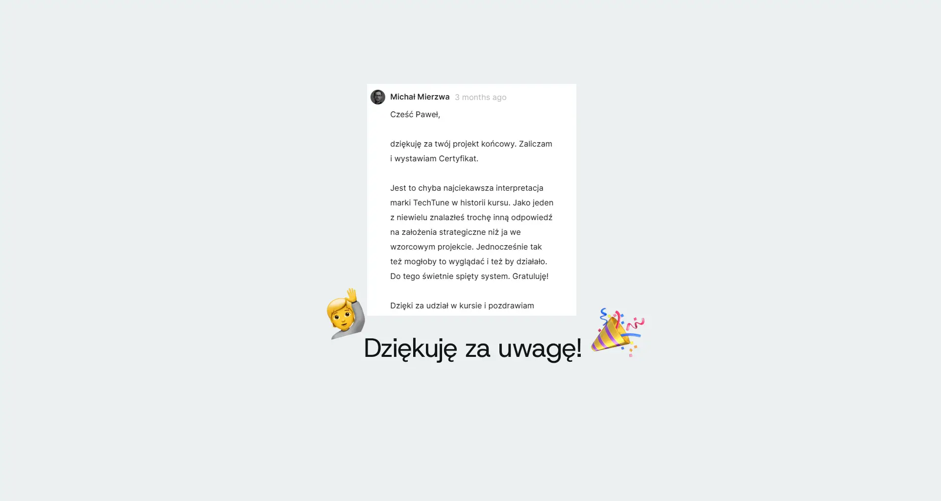 Praca nad brandingiem Techtune nauczyła mnie, jak łączyć estetykę techniczną z emocjonalnym storytellingiem, jak zamienić złożoność technologii w inspirującą, czytelną narrację wizualną. W przyszłości chciałbym rozwinąć tę koncepcję o testy wśród docelowej grupy twórców, by jeszcze lepiej dopasować komunikację do ich sposobu myślenia o muzyce i sprzęcie.