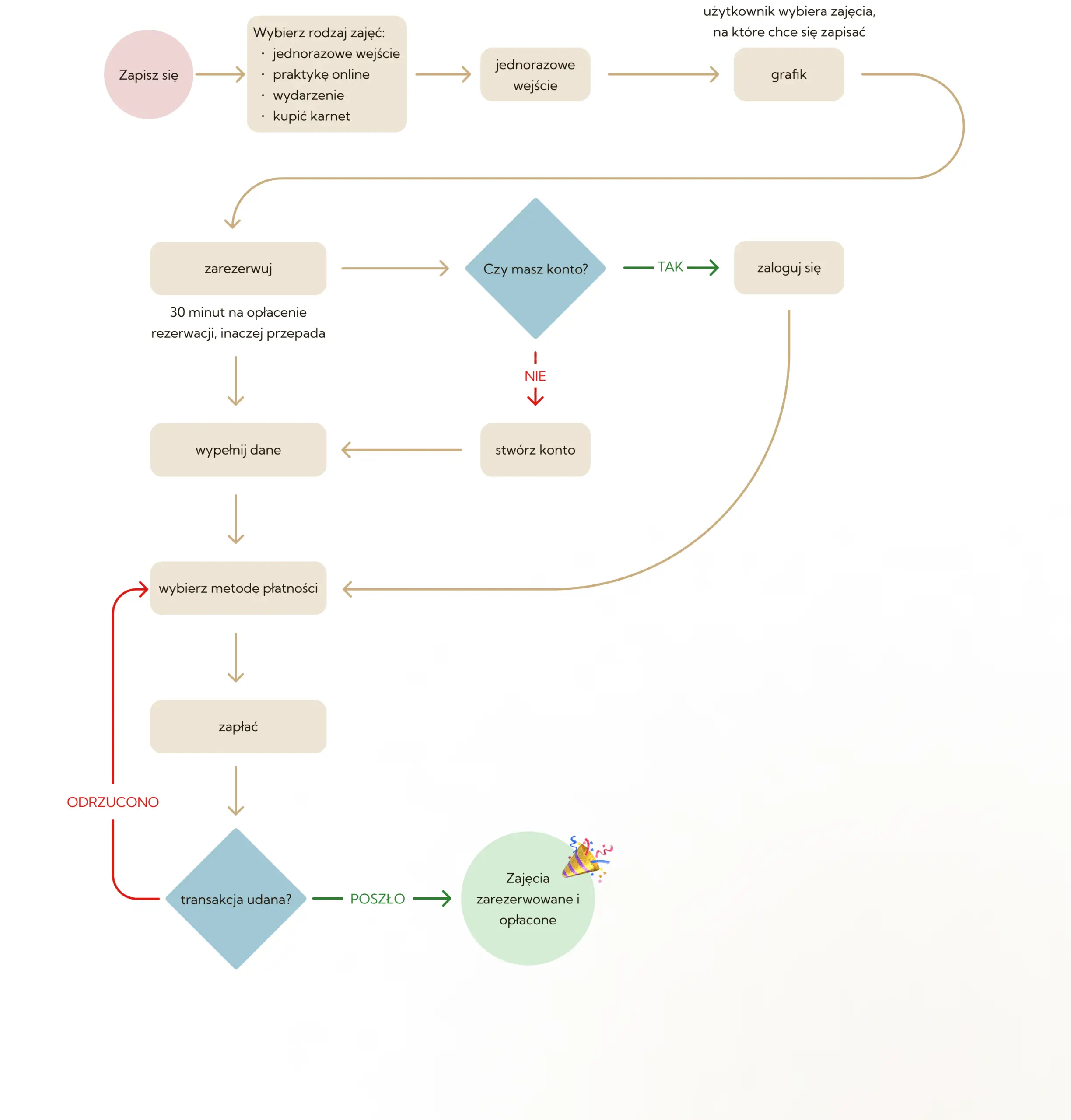 User flow zostało zaprojektowane tak by pozwolić użytkownikom szybko zarezerwować zajęcia nawet bez konta. Rezerwacja z obowiązkiem zapłaty, by uniknąć sztucznych rezerwacji.